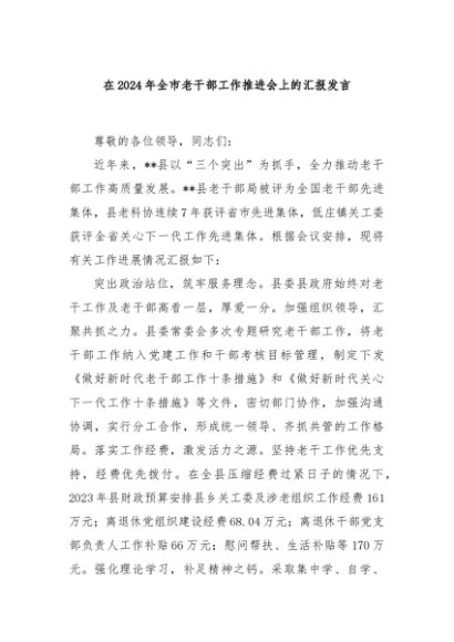 / 【七哥公文】2024年:在2024年全市老干部工作推进会上的汇报发言+更多免费公文+VX:QiGeGongWen2024