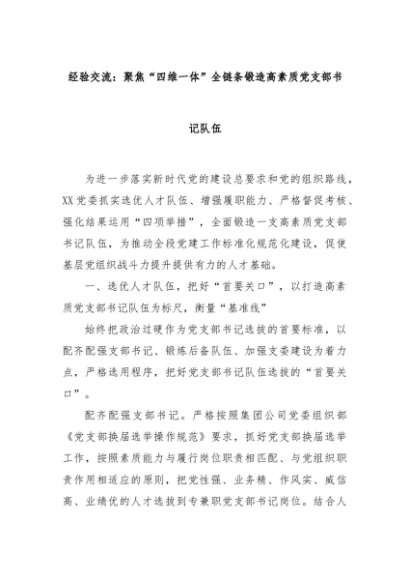 【七哥公文】2024年:经验交流:聚焦“四维一体”全链条锻造高素质党支部书记队伍+更多免费公文+VX:QiGeGongWen2024