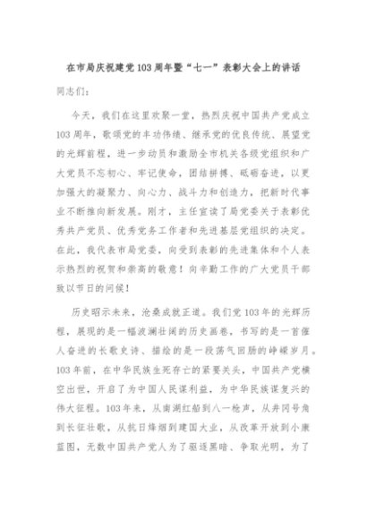 【七哥公文】2024年:在市局庆祝建党103周年暨“七一”表彰大会上的讲话+更多免费公文+VX:QiGeGongWen2024