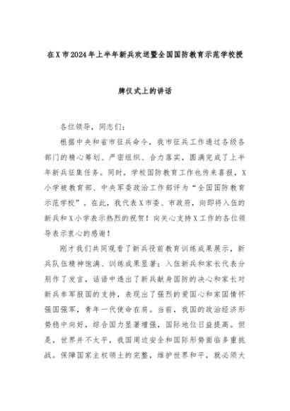 【七哥公文】2024年:在X市2024年上半年新兵欢送暨全国国防教育示范学校授牌仪式上的讲话+更多免费公文+VX:QiGeGongWen2024