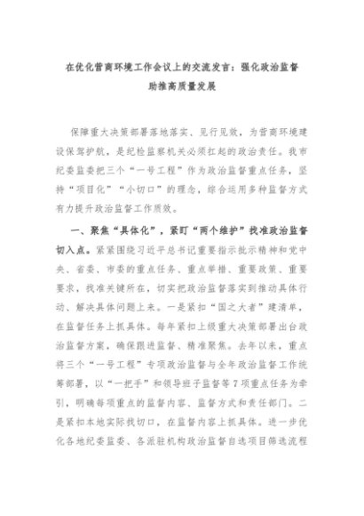 【七哥公文】2024年:在优化营商环境工作会议上的交流发言:强化政治监督 助推高质量发展+更多免费公文+VX:QiGeGongWen2024
