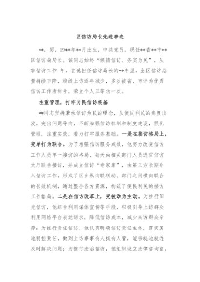 / 【七哥公文】2024年:区信访局长先进事迹+更多免费公文+VX:QiGeGongWen2024