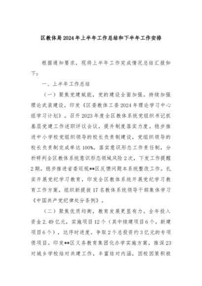 / 【七哥公文】2024年:区教体局2024年上半年工作总结和下半年工作安排+更多免费公文+VX:QiGeGongWen2024