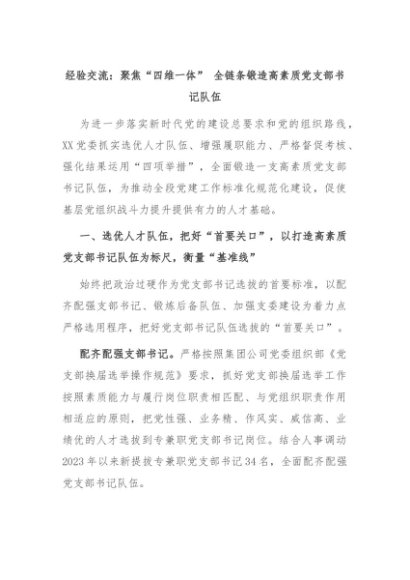 【七哥公文】2024年:经验交流:聚焦“四维一体” 全链条锻造高素质党支部书记队伍+更多免费公文+VX:QiGeGongWen2024