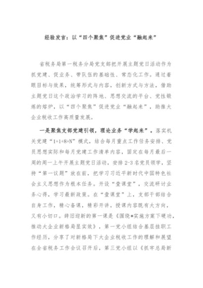 / 【七哥公文】2024年:经验发言:以“四个聚焦”促进党业“融起来”+更多免费公文+VX:QiGeGongWen2024