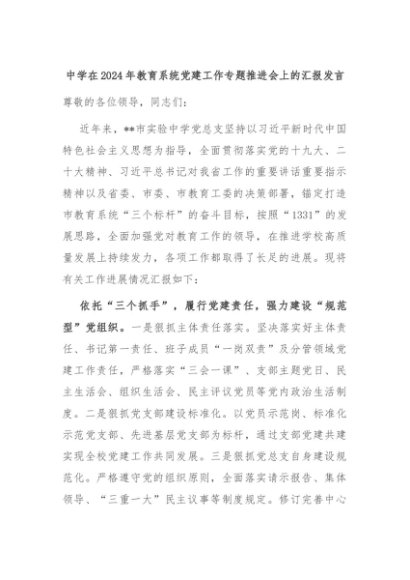 【七哥公文】2024年:中学在2024年教育系统党建工作专题推进会上的汇报发言+更多免费公文+VX:QiGeGongWen2024