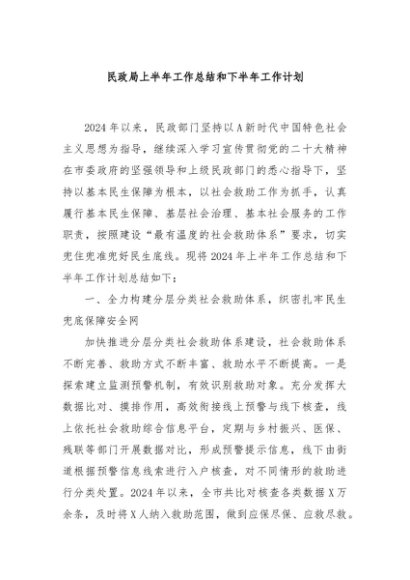 / 【七哥公文】2024年:民政局上半年工作总结和下半年工作计划+更多免费公文+VX:QiGeGongWen2024