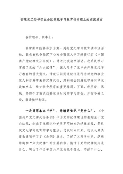 【七哥公文】2024年:街道党工委书记在全区党纪学习教育读书班上的交流发言+更多免费公文+VX:QiGeGongWen2024