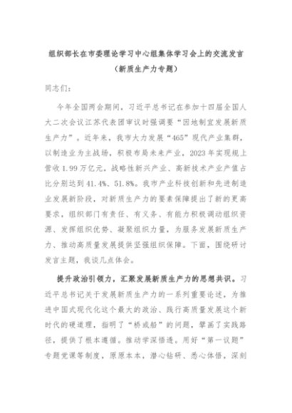 【七哥公文】2024年:组织部长在市委理论学习中心组集体学习会上的交流发言(新质生产力专题)+更多免费公文+VX:QiGeGongWen2024