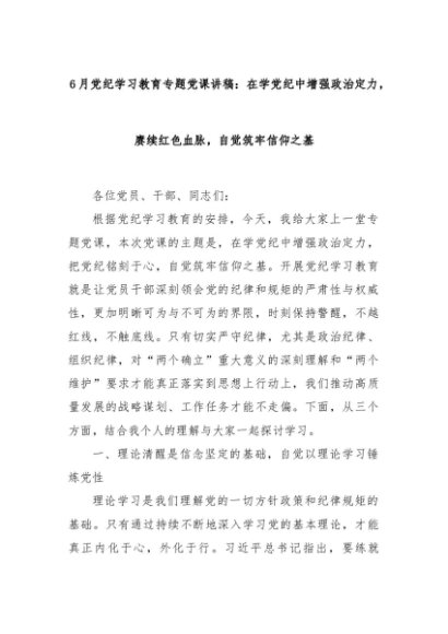 【七哥公文】2024年:6月党纪学习教育专题党课讲稿:在学党纪中增强政治定力,赓续红色血脉,自觉筑牢信仰之基+更多免费公文+VX:QiGeGongWen2024