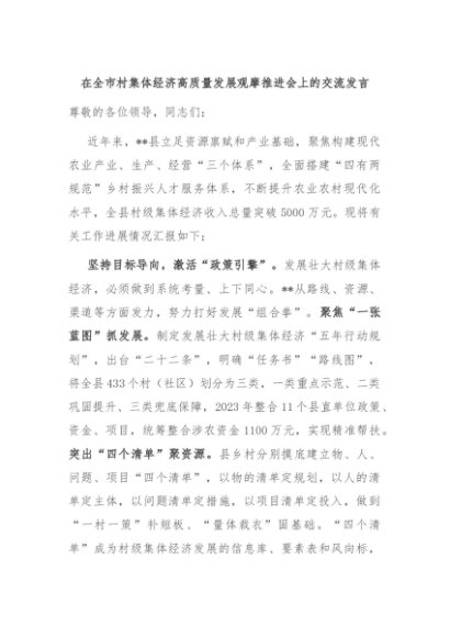 / 【七哥公文】2024年:在全市村集体经济高质量发展观摩推进会上的交流发言+更多免费公文+VX:QiGeGongWen2024