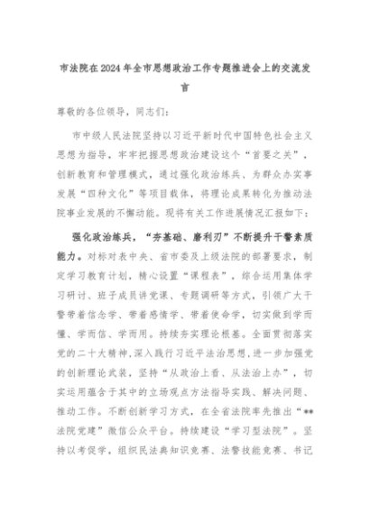 【七哥公文】2024年:市法院在2024年全市思想政治工作专题推进会上的交流发言+更多免费公文+VX:QiGeGongWen2024