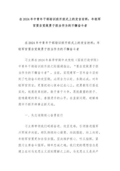【七哥公文】2024年:在2024年中青年干部培训班开班式上的发言材料:年轻军官要自觉做勇于担当作为的不懈奋斗者+更多免费公文+VX:QiGeGongWen2024