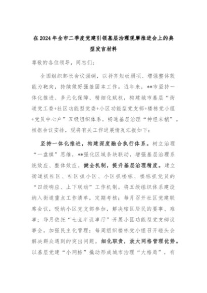 【七哥公文】2024年:在2024年全市二季度党建引领基层治理观摩推进会上的典型发言材料+更多免费公文+VX:QiGeGongWen2024