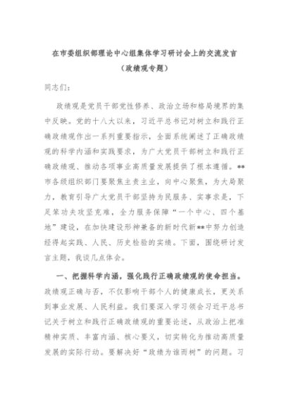 【七哥公文】2024年:在市委组织部理论中心组集体学习研讨会上的交流发言(政绩观专题)+更多免费公文+VX:QiGeGongWen2024