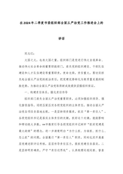 【七哥公文】2024年:在2024年二季度市委组织部全面从严治党工作推进会上的讲话+更多免费公文+VX:QiGeGongWen2024