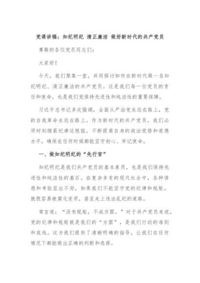 【七哥公文】2024年:党课讲稿:知纪明纪 清正廉洁 做好新时代的共产党员+更多免费公文+VX:QiGeGongWen2024