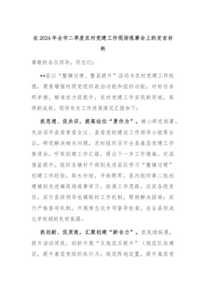 【七哥公文】2024年:在2024年全市二季度农村党建工作现场观摩会上的发言材料+更多免费公文+VX:QiGeGongWen2024