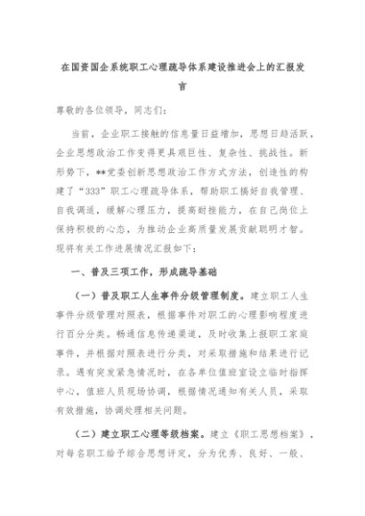 【七哥公文】2024年:在国资国企系统职工心理疏导体系建设推进会上的汇报发言+更多免费公文+VX:QiGeGongWen2024