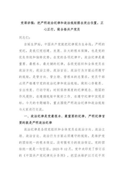 【七哥公文】2024年:党课讲稿:把严明政治纪律和政治规矩摆在突出位置,正心正行,做合格共产党员+更多免费公文+VX:QiGeGongWen2024