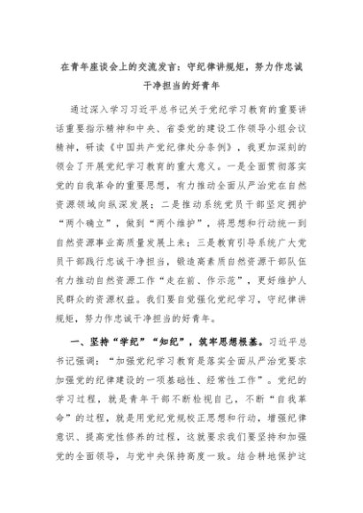 【七哥公文】2024年:在青年座谈会上的交流发言:守纪律讲规矩,努力作忠诚干净担当的好青年+更多免费公文+VX:QiGeGongWen2024