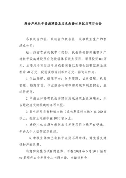 / 【七哥公文】2024年:粮食产地烘干设施建设及应急救援体系试点项目公告+更多免费公文+VX:QiGeGongWen2024
