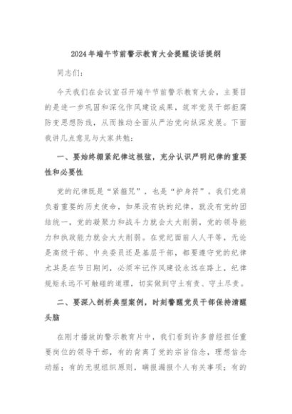 / 【七哥公文】2024年:2024年端午节前警示教育大会提醒谈话提纲+更多免费公文+VX:QiGeGongWen2024