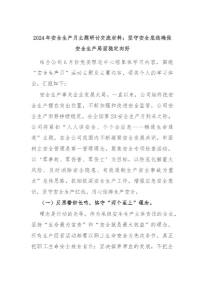 【七哥公文】2024年:2024年安全生产月主题研讨交流材料:坚守安全底线确保安全生产局面稳定向好+更多免费公文+VX:QiGeGongWen2024