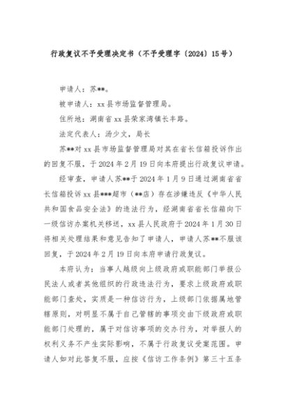 【七哥公文】2024年:行政复议不予受理决定书(不予受理字〔2024〕15号)+更多免费公文+VX:QiGeGongWen2024