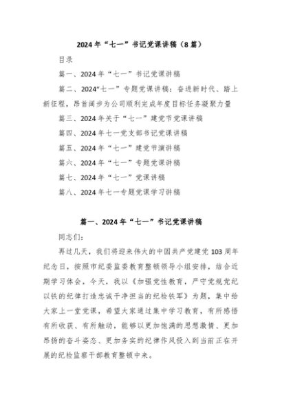 / 【七哥公文】2024年:(8篇)2024年“七一”书记党课讲稿+更多免费公文+VX:QiGeGongWen2024