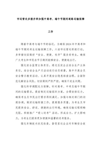 【七哥公文】2024年:市运管处多措并举加强中高考、端午节期间道路运输保障工作+更多免费公文+VX:QiGeGongWen2024