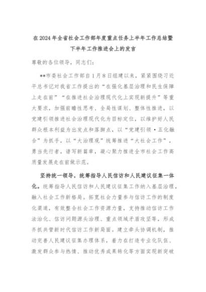 【七哥公文】2024年:在2024年全省社会工作部年度重点任务上半年工作总结暨下半年工作推进会上的发言+更多免费公文+VX:QiGeGongWen2024