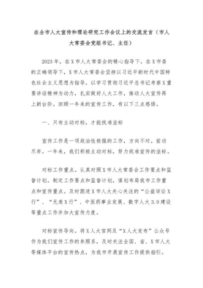 【七哥公文】2024年:在全市人大宣传和理论研究工作会议上的交流发言(市人大常委会党组书记、主任)+更多免费公文+VX:QiGeGongWen2024