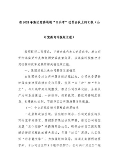 【七哥公文】2024年:在2024年集团党委巡视“回头看”动员会议上的汇报(公司党委向巡视组汇报)+更多免费公文+VX:QiGeGongWen2024