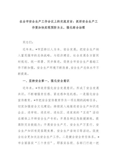 【七哥公文】2024年:在全市安全生产工作会议上的交流发言:抓好安全生产工作要加快实现预防为主,强化综合治理+更多免费公文+VX:QiGeGongWen2024