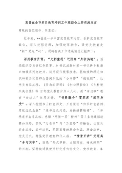 / 【七哥公文】2024年:某县在全市党员教育培训工作座谈会上的交流发言+更多免费公文+VX:QiGeGongWen2024