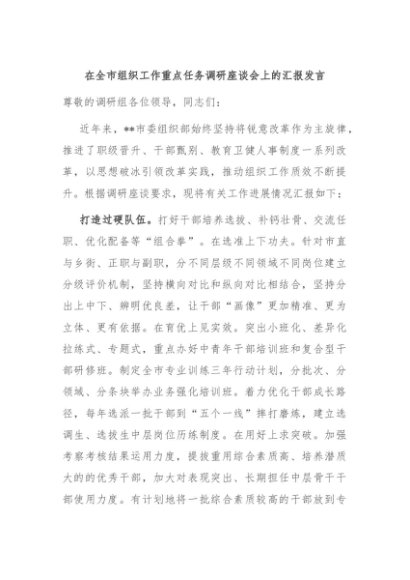 / 【七哥公文】2024年:在全市组织工作重点任务调研座谈会上的汇报发言+更多免费公文+VX:QiGeGongWen2024