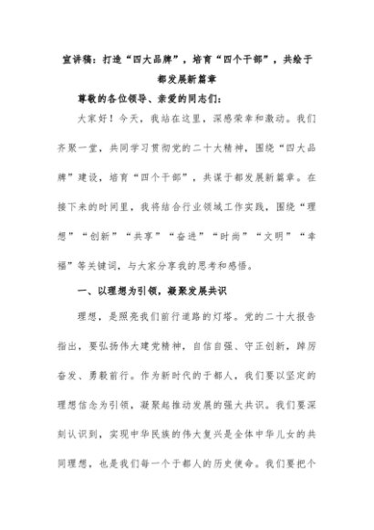 【七哥公文】2024年:宣讲稿:贯彻党的二X大精神,打造“四大品牌”,培育“四个干部”,共绘于都发展新篇章+更多免费公文+VX:QiGeGongWen2024