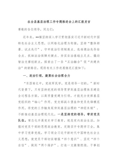/ 【七哥公文】2024年:在全县基层治理工作专题推进会上的汇报发言+更多免费公文+VX:QiGeGongWen2024