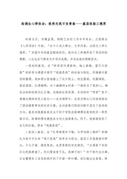 【七哥公文】2024年:选调生心得体会:我将无我不负青春——基层体验三境界+更多免费公文+VX:QiGeGongWen2024