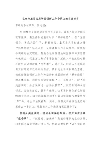 / 【七哥公文】2024年:在全市基层法庭诉前调解工作会议上的交流发言+更多免费公文+VX:QiGeGongWen2024