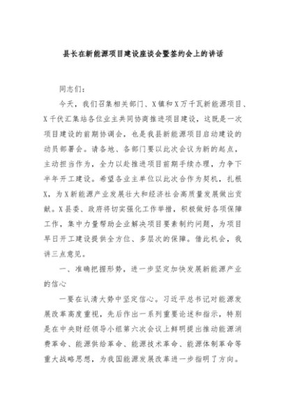 / 【七哥公文】2024年:县长在新能源项目建设座谈会暨签约会上的讲话+更多免费公文+VX:QiGeGongWen2024