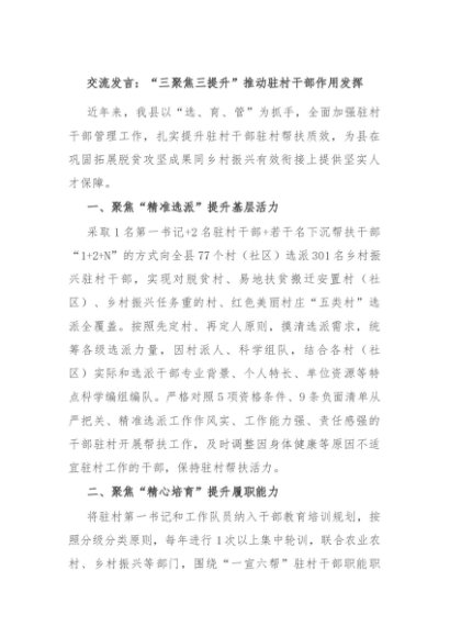 / 【七哥公文】2024年:交流发言:“三聚焦三提升”推动驻村干部作用发挥+更多免费公文+VX:QiGeGongWen2024