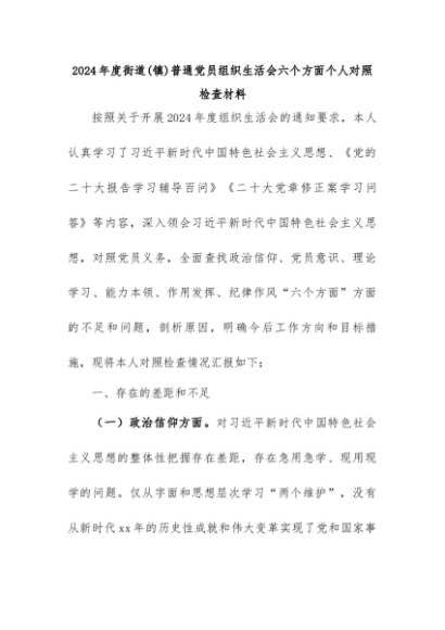 【七哥公文】2024年:2024年度街道(镇)普通党员组织生活会六个方面个人对照检查材料+更多免费公文+VX:QiGeGongWen2024