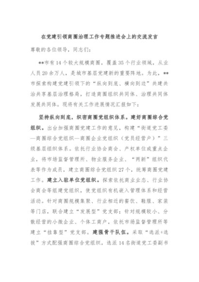 / 【七哥公文】2024年:在党建引领商圈治理工作专题推进会上的交流发言+更多免费公文+VX:QiGeGongWen2024