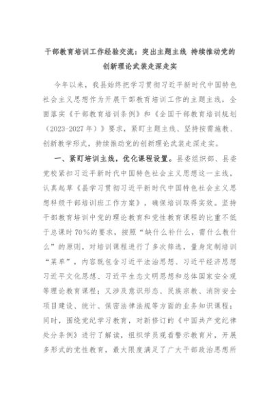【七哥公文】2024年:干部教育培训工作经验交流:突出主题主线 持续推动党的创新理论武装走深走实+更多免费公文+VX:QiGeGongWen2024