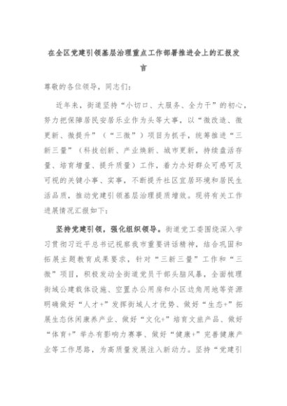 【七哥公文】2024年:在全区党建引领基层治理重点工作部署推进会上的汇报发言+更多免费公文+VX:QiGeGongWen2024