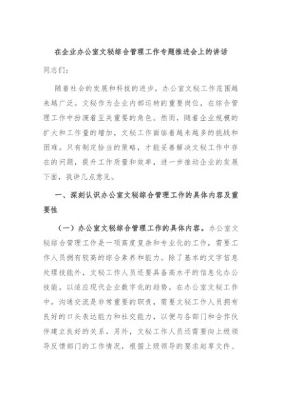 / 【七哥公文】2024年:在企业办公室文秘综合管理工作专题推进会上的讲话+更多免费公文+VX:QiGeGongWen2024