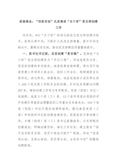 【七哥公文】2024年:经验做法:“四抓四创”扎实推进“五个好”党支部创建工作+更多免费公文+VX:QiGeGongWen2024