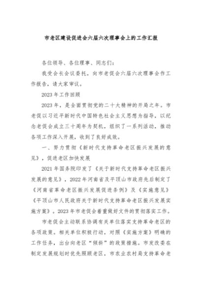/ 【七哥公文】2024年:市老区建设促进会六届六次理事会上的工作汇报+更多免费公文+VX:QiGeGongWen2024